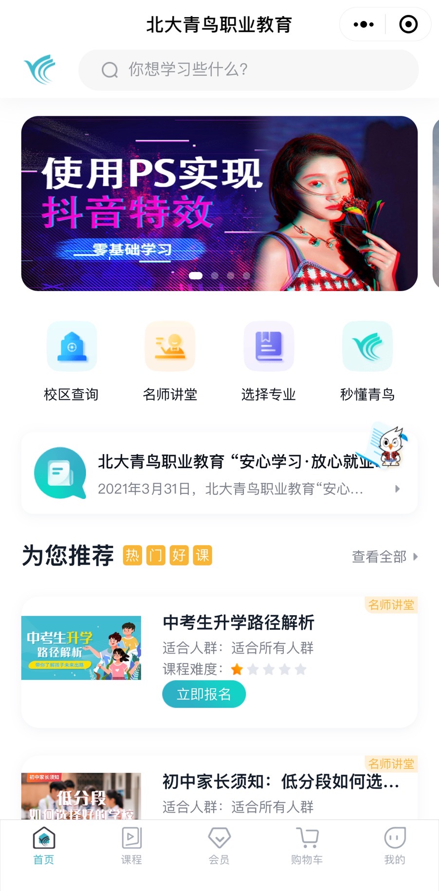 ? ? ? 2020年9月30日时代创信正式签约北大青鸟,制作北大青鸟微信小程序。目前已正式上线并使用。我们凭借多年的小程序开发定制服务经验,根据北大青鸟专业职业教育的特性,专业为北大青鸟定制属于他自己的小程序--“北大青鸟职业教育”。给更多的学员提供了选课、报名、咨询等提供了更方便快捷的路径。